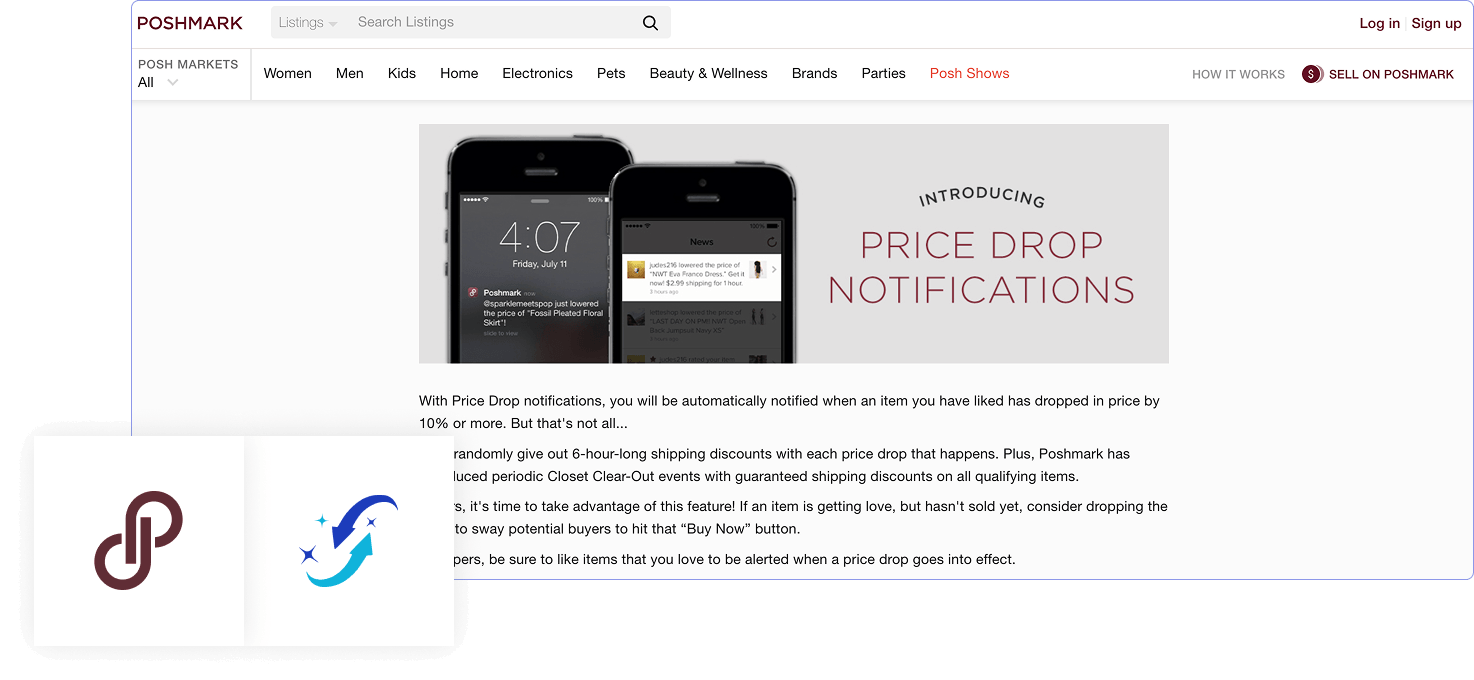 Poshmark Closet Clear Out is a recurring promotional event where sellers lower listing prices by at least 10% from the lowest historical price, and in return, Poshmark provides buyers with guaranteed discounted shipping on those items (as opposed to randomly applied shipping discounts outside of CCO events). When a seller drops a qualifying item’s price during a CCO event, Poshmark sends a push notification to every user who has previously liked that listing. Buyers who receive a notification then have approximately 6 hours to take advantage of the reduced price and discounted shipping.
